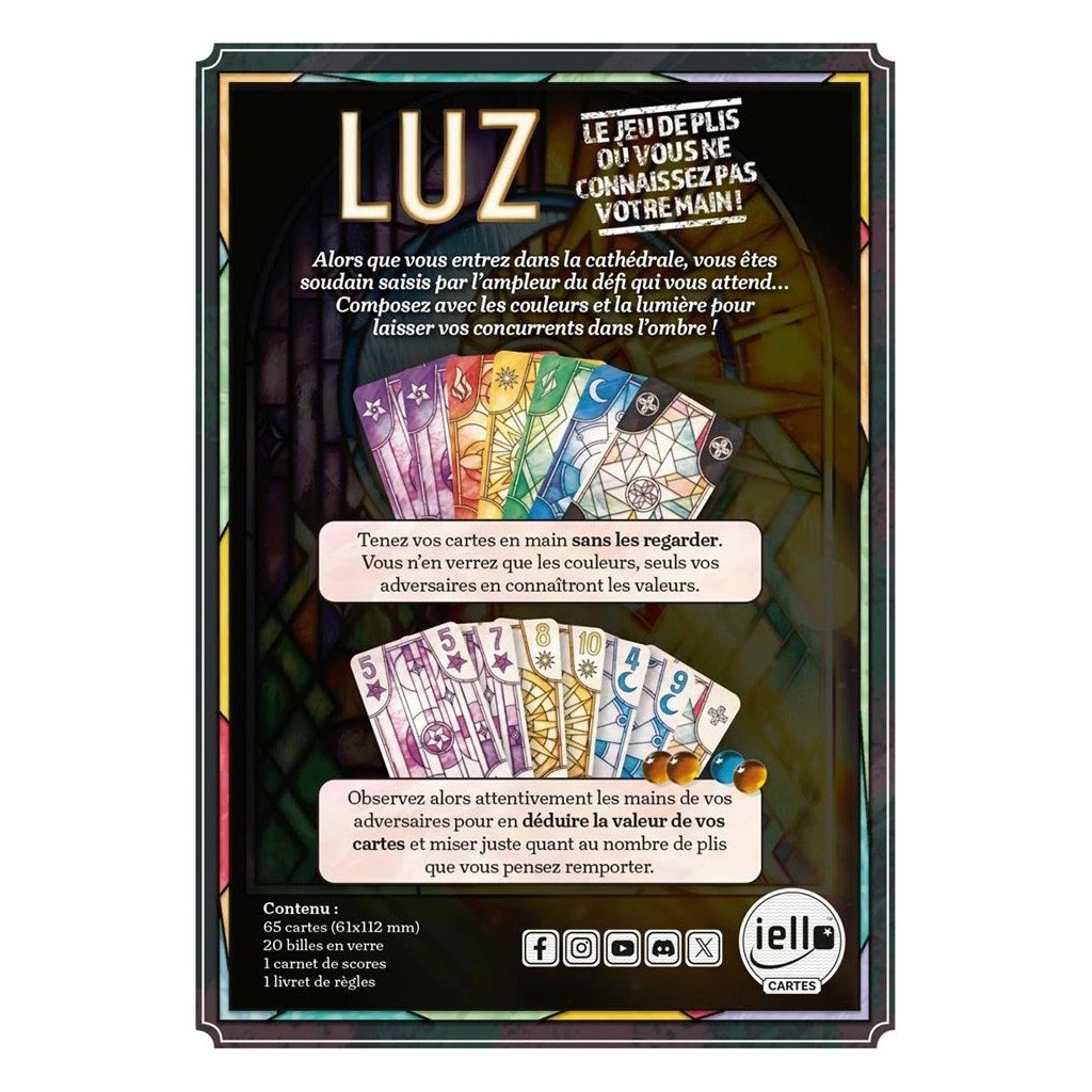 Bienvenue dans l’univers fascinant de Luz, en tant que meilleurs maîtres-verriers du monde, vous êtes appelés à créer des vitraux d’une beauté inégalée. Mais attention, la subtilité de Luz réside dans le fait que vous ne connaissez pas la valeur exacte de vos propres cartes ! Vous devrez déduire, parier et manœuvrer habilement pour surpasser vos concurrents et laisser votre empreinte dans l’histoire du verre.